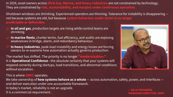 SMEC specializes in stabilizing and modernizing safety systems on live assets — across Oil & Gas, Marine, Power, and Heavy Industry — without disrupting operations.