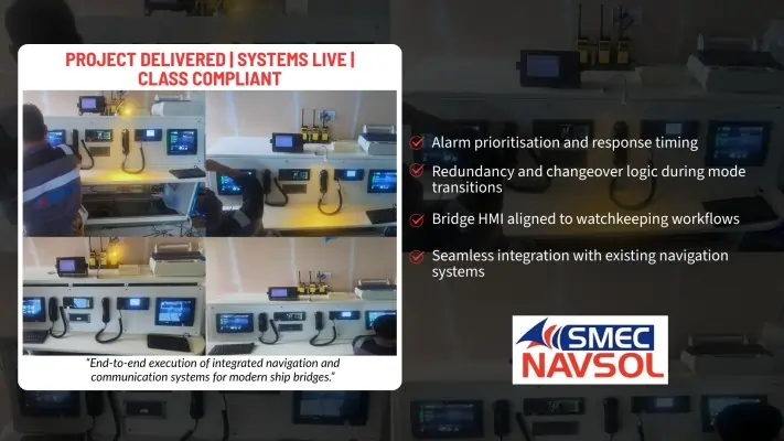 SMEC NAVSOL delivered the installation and commissioning of navigation and radio communication systems, including integrated radio consoles, on operating vessels under live bridge conditions.