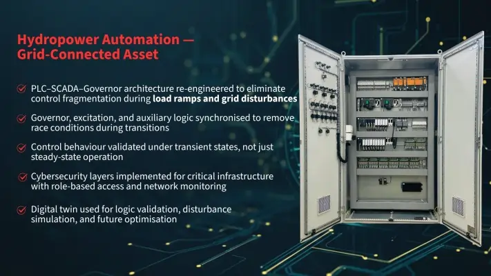 For a major grid-connected asset, we re-engineered the PLC–SCADA–Governor architecture to solve control fragmentation.